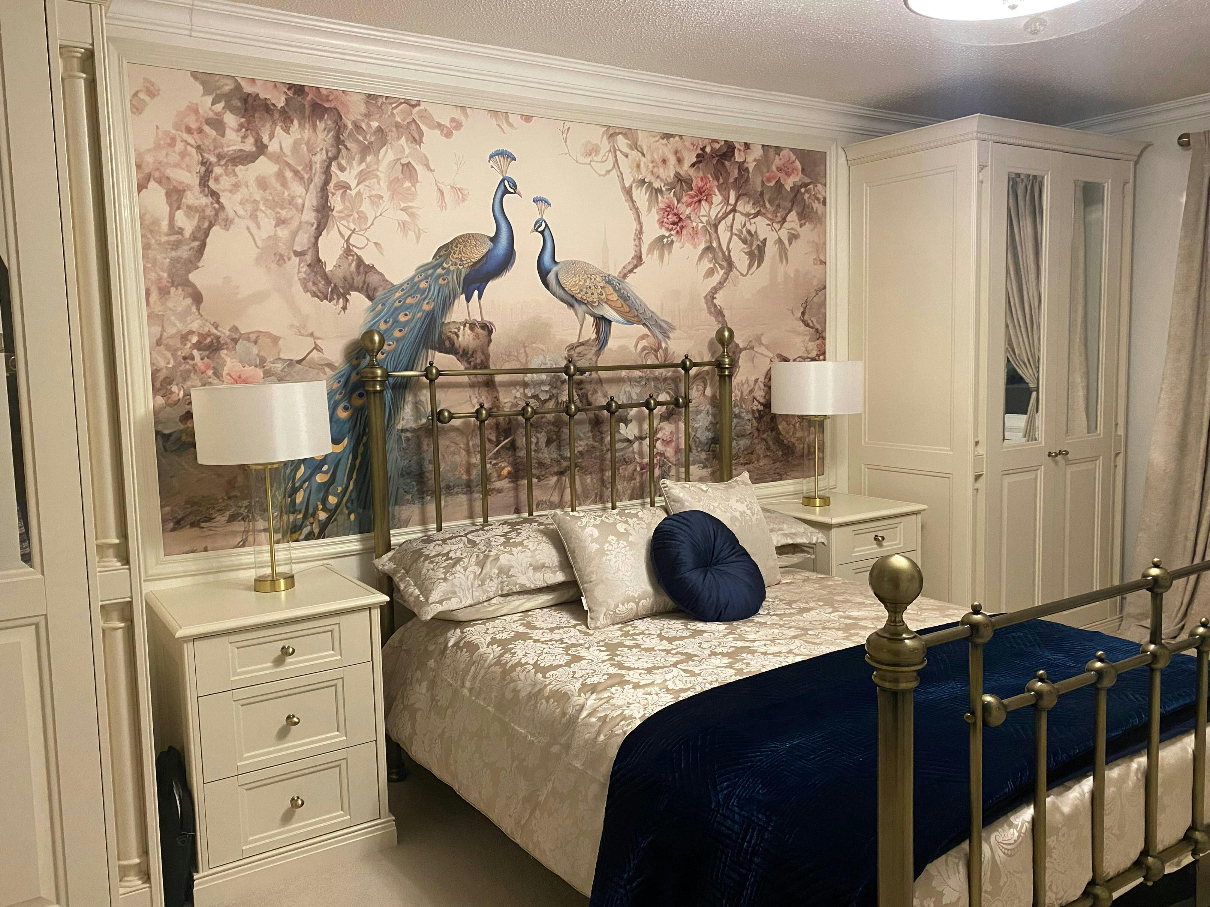 Chinoiserie Peacock Wallpaper features a stunning design with elegant peacocks and intricate patterns, creating a captivating birds wall mural that adds a touch of sophistication and charm to any room.